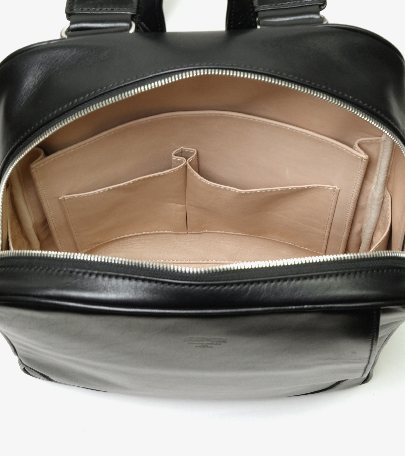 ホースハイド バックパック ビジネスシーンにも馴染む、シンプルモダンなバックパックです。 外装はクロムなめしホースハイドのクラウド、内装にはホースハイド「BG/ベージュカラー」を用いた、内外装ともにホースハイドを用いたフルレザー仕様です。 定期的なメンテナンスを施すことで、より長くご使用いただけます。